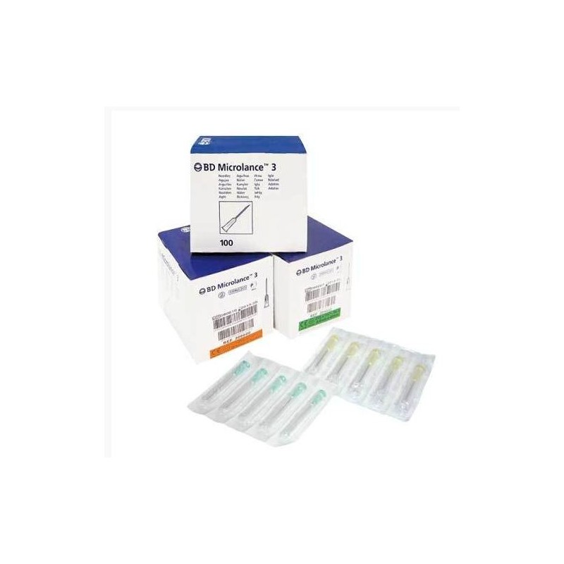 BD Microlance Agujas Hipodérmicas Agujas hipodérmicas, estériles. Usar una sola vez. Apirógenas. El bisel de las agujas Microlance está diseñado siguiendo la más moderna tecnología. Un avanzado diseño del bisel con bajo ángulo de rotación, un proceso único de pulido y un lubricante bajo en fricción hacen que sea la aguja más afilada posible, permitiendo administrar inyecciones a los pacientes de la forma más indolora. Estudios in-vitro e in-vivo demuestran la superior calidad del índice de penetración de las agujas Microlance . Uso recomendado en inyecciones intradérmicas, subcutáneas, intramusculares e intravenosas. Características Beneficios Bisel de triple facetado El ángulo de rotación de los biseles otorga mayor poder de penetración. Paredes delgadas Su mayor diámetro interno mejora el flujo y permite el uso de agujas más finas. Nuevo lubricante de grado médico Su fórmula consigue un bajo índice de fricción facilitando la penetración y el deslizamiento. Sistema de pulido electrónico Junto con la calidad del acero, permite eliminar toda aspereza de la superficie de la cánula. Cono luer y luer lok Garantiza una perfecta y segura conexión con la jeringa. Cono translúcido, con colores normalizados internacionalmente El pabellón translúcido de polipropileno virgen está diseñado para permitir la visualización de los medicamentos y de los fluidos corporales. Los colores normalizados identifican el diámetro externo de la aguja.