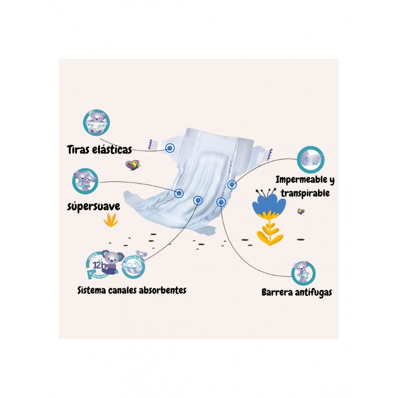 Barreras antifugas y cintura elástica, que evitan escapes y se ajustan con comodidad al cuerpo del recién nacido.