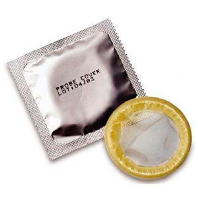 Funda en forma de dedo enrollada sobre si misma para facilitar su colocación que se adapta a la forma del transductor de ecógrafo.